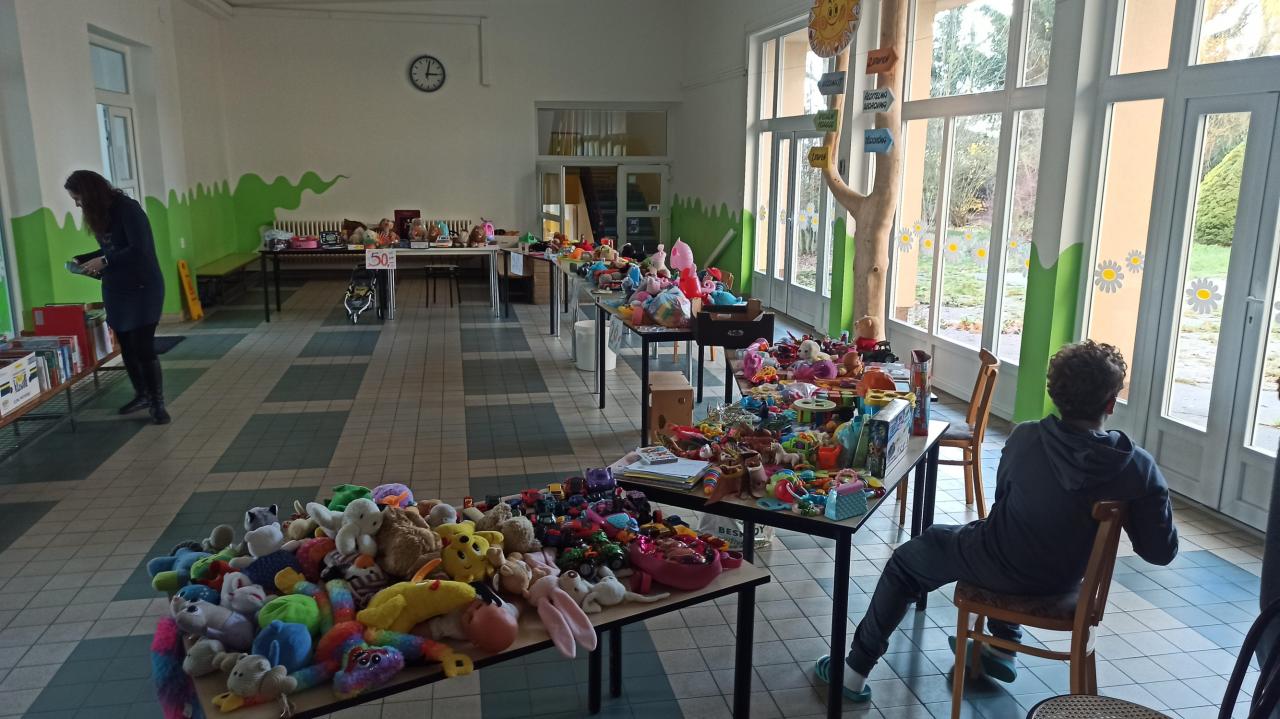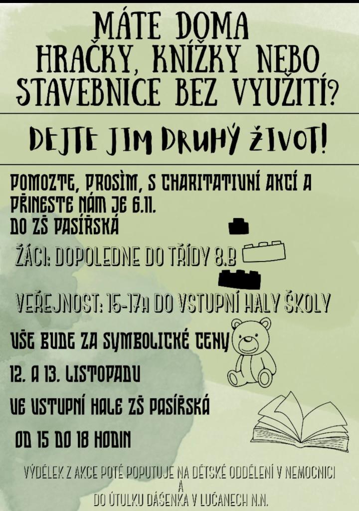 Organizace celého projektu začala v průběhu měsíce září, ale plány se několikrát měnily, upravovaly, předělávaly a zlepšovaly. Nakonec jsme se domluvili, že uspořádáme bazar, kde budeme lidem za malý peníz nabízet hračky, knihy a stavebnice, které někdo už doma nepotřebuje a někomu jinému zase udělají radost. A vybrané peníze právě poputují na dobročinné účely. Po finálním rozhodnutí, kam se vybrané peníze dají, jsme přistoupili k další fázi – informační plakáty. Přibyla nám várka věcí, které bylo potřeba vyřešit, např. datum, kdy se budou hračky od lidí vybírat a posléze prodávat, a co s těmi, které se neprodají. Ale i přes všechny překážky a několik předělávání se plakáty na pátý pokus povedly. A bylo rozhodnuto. Výběr hraček se tedy uskutečnil 6. 11. 2025 během třídních schůzek, přičemž se jich vybralo poměrně dost. Ty se poté dne 12. a 13. 11. 2025 prodávaly. Výdělek činil více než 8 tisíc korun. No a nebudu lhát, když napíšu, že jsme byli příjemně překvapeni. Byli jsme moc vděční lidem, kteří nám něco věnovali i těm, kteří si přišli nakoupit, třeba i vánoční dárky. Tím ale naše práce neskončila. Ve čtvrtek 4. 12. 2025 jsme šli peníze předat do útulku Dášenka, kde s nimi dobře naloží.